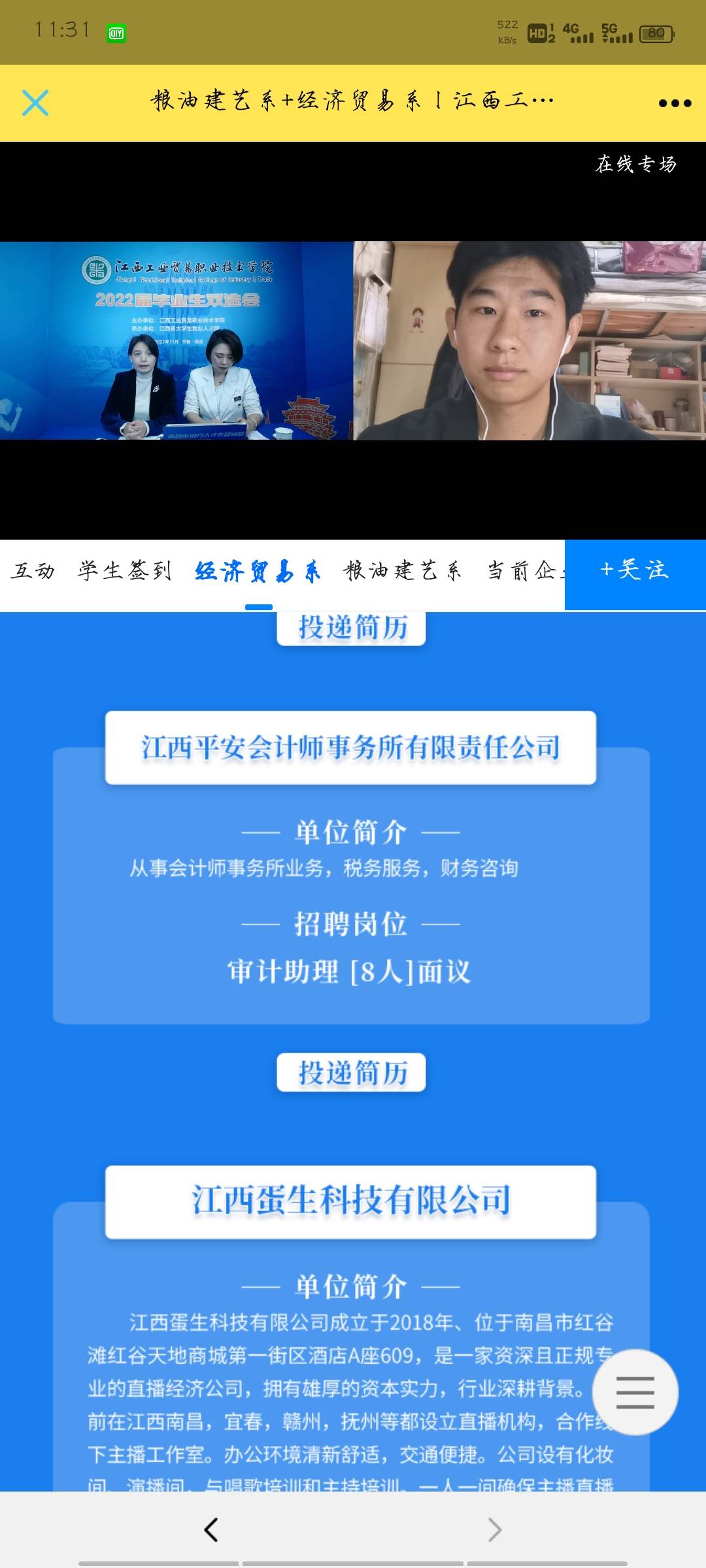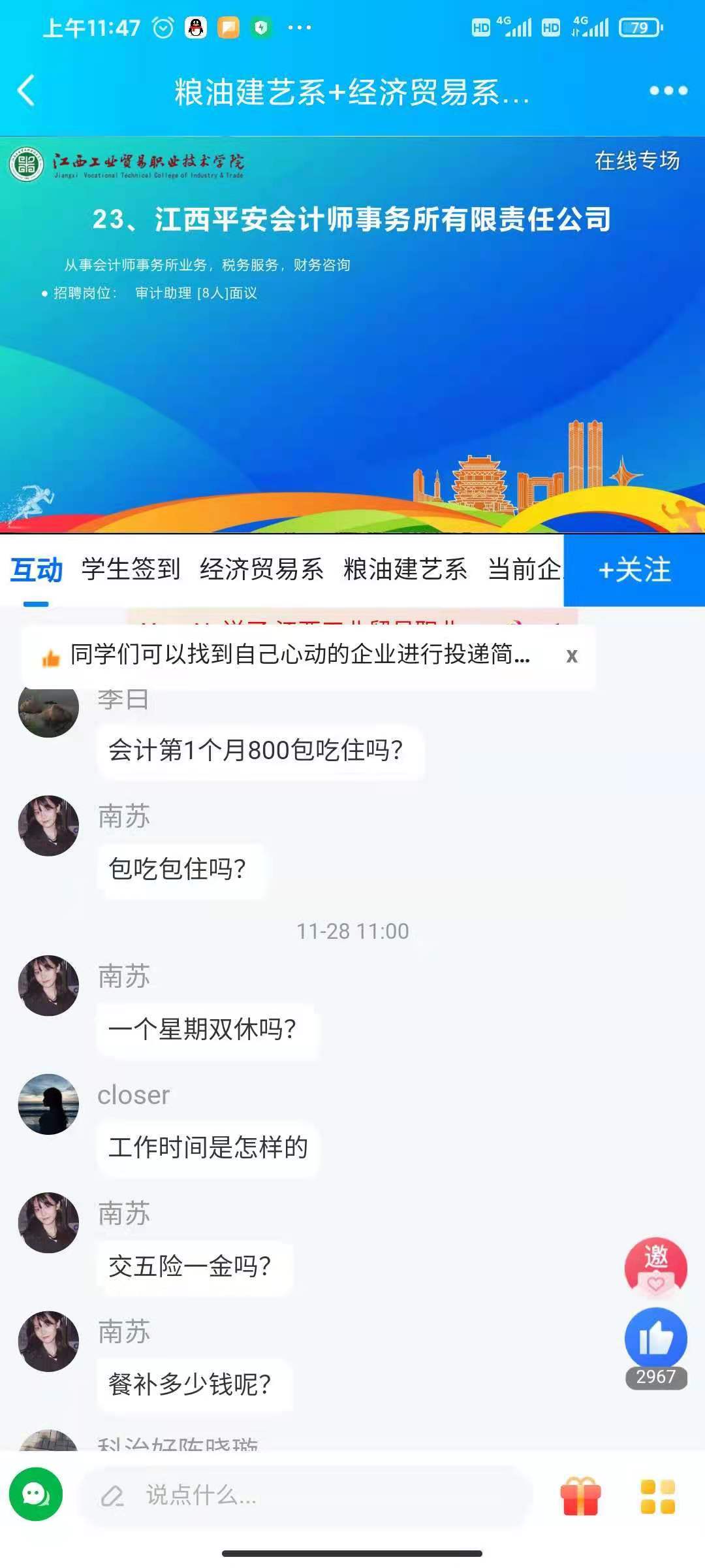 在双选直播环节,江西平安会计师事务所向我校毕业生介绍了公司基本情况概况,从岗位需求、福利薪资待遇、培养路径等方面对招聘岗位进行推介解读,与求职者在线互动,回答学生关注的问题。
