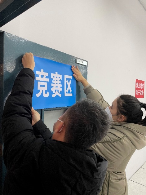 云计算赛项前期的准备工作事项繁多,内容繁杂,为了保障赛事顺利开展,我系提前做好了充分的计划和安排。协调厂家对赛场设备环境进行组装与调试,我系志愿者老师们细心地做好每一项工作,贴好地标、指示标、打扫赛场卫生、物料装袋等,为参赛选手们指路引航,助力参赛队伍安心比赛。
