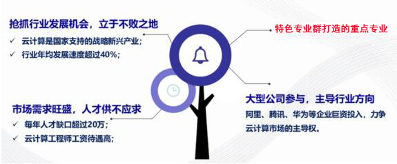 云计算是战略性新兴产业中的重点发展领域,市场需求旺盛,人才供不应求,就业薪资高。阿里、腾讯、天翼、华为等主流企业巨资投入,力争云市场的主导权。