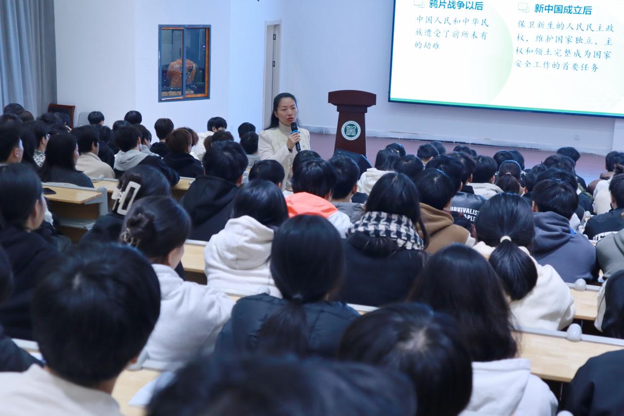 国家安全是国家发展的基石。维护国家安全,事关国运兴衰,事关发展大计,事关人民福祉。陶晓峰以近日的“巴以冲突”为切入点,导课引出本次主题“以新安全格局保障新发展格局”。她从“保证国家安全是头等大事”、“必须坚持总体国家安全观”以及“开创国家安全工作新局面”等三方面,系统阐释了保证国家安全的极端重要性。她运用生动的语言、鲜活的事例和严谨的逻辑,深入浅出地为学生诠释了“新安全格局”的重要意义。
