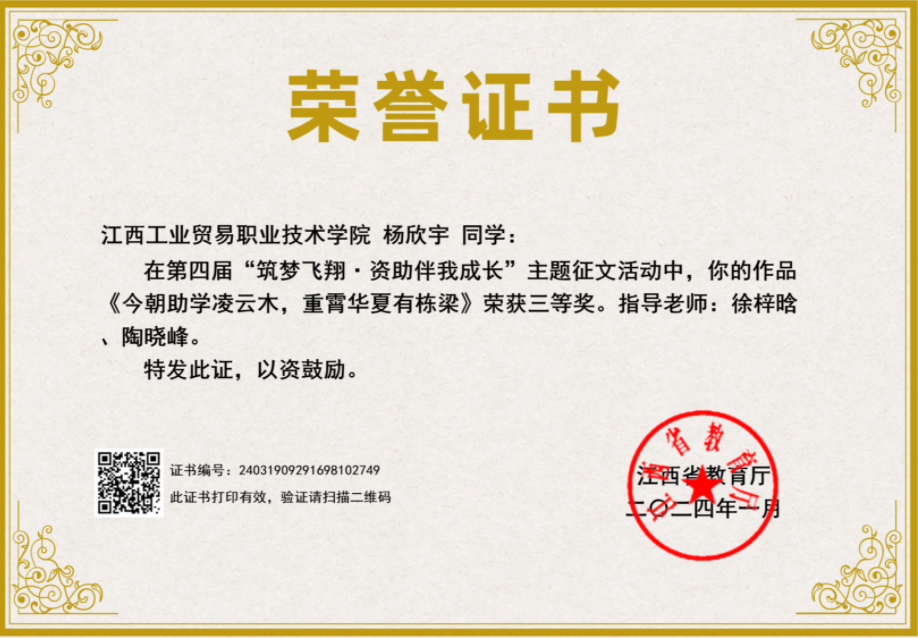 杨欣宇,22大数据技术班班长,2022-2023学年获得学院二等奖学金和三等奖学金,在校表现优异,在学院被评为三好学生,优秀学生干部和军训标兵。他性格沉稳,能力突出,收到师生的一致好评。他勇于实践,注重学有所用和学习创新。他有着突出的理解和分析能力,成绩一直稳步提升,总居班级前列。他积极主动,勤于组织,多次参加学院活动并获奖。在参加学院第十八届“红五月”文化艺术节获得二等奖,第六届“工贸春天”征文摄影书画大赛活动获得三等奖,“心理情景剧”剧本评选大赛三等奖。更是获得过省级“强国有我,青春有为”暑期社会实践活动暨2023年“万名大学生进千站”文明实践志愿服务行动特等奖荣誉和江西省第四届“筑梦飞翔·资助伴我成长”主题征文活动三等奖。天行健,君子以自强不息,失去父亲的他并没有意志消沉,而是坚强地、勇敢地生活,展现自己的光。