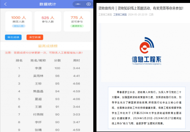 一场资助知识答题赛。本次竞赛依托系部微信公众号平台,将题库导入系统,以单选题,多选题,判断题的形式,内容涵盖国家资助政策、金融知识、征信知识等方面的内容,随机题目进行答题,充分保证公平公正性。通过答题的方式使同学们深入了解国家政策,增强了对资助体系的认识和理解。此次比赛经统计共500余人参加,其中22计算机网络技术2班李康以100分用时3分44秒获得第一名。