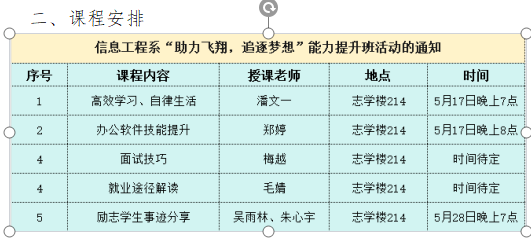 开班第二课:由郑婷老师进行“办公软件技能提升”培训。在这堂课上,郑婷老师细致入微地讲解了各种办公软件的高级应用,如 Word的精美排版、Excel的数据分析、PowerPoint的精彩演示制作等。尤其以PPT为重点,从内容字体、字号,翻页动画等多方面,教会大家PPT制作的内容要能突出重点,并且注重实用性和操作性,并且。在郑婷老师的演示下,同学们在实际操作中学习提升了自己的技能。