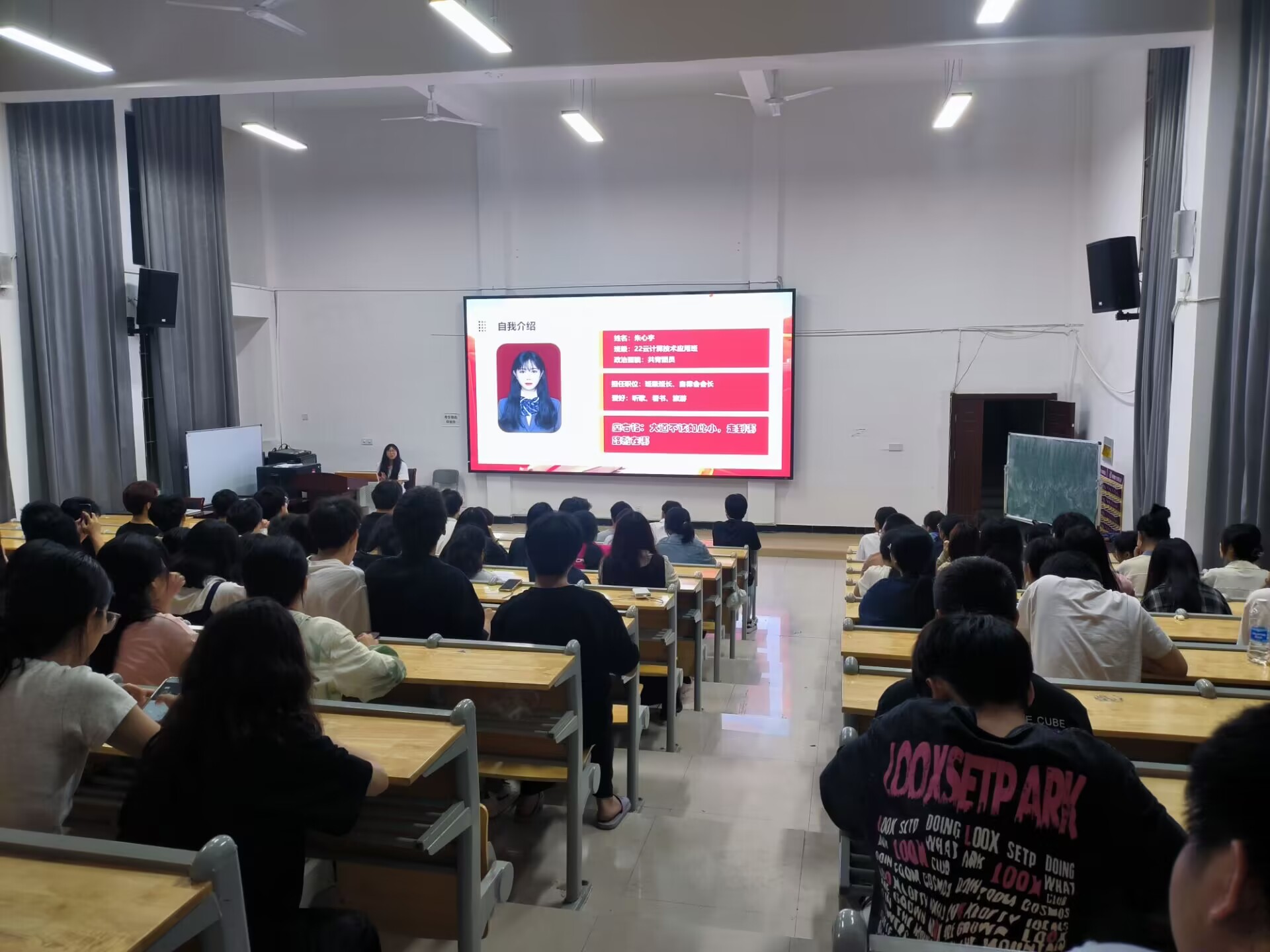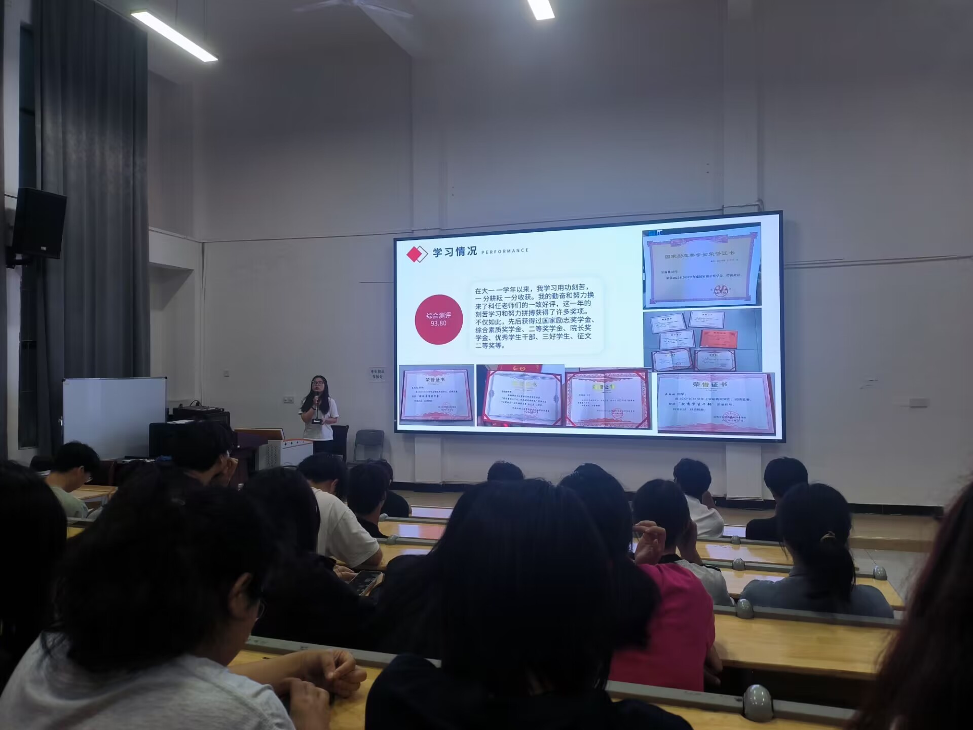 开班第五课:由学生代表吴雨林、朱心宇两位优秀学生分别进行事迹分享。吴雨林和朱心宇同学从思想、学习、生活、工作四个方面讲述了自己一步步在大学平台上成长的过程。她们鼓励大家,面对困难时不要轻易放弃,要相信自己的潜力,勇往直前,要敢于尝试新事物,勇于挑战自己,不断突破自己的极限。