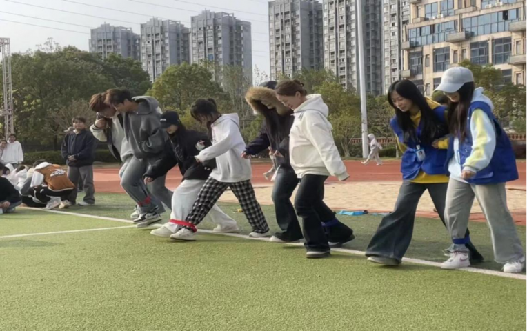 而在两人三足游戏中,同学们两两组合,小小的绑带化作纽带将彼此联系在一起,大家喊着整齐的口号,步伐协调一致,互相搀扶,互相鼓舞,在行进中悄然释放内心压力,领悟团队合作和团队精神的重要性。