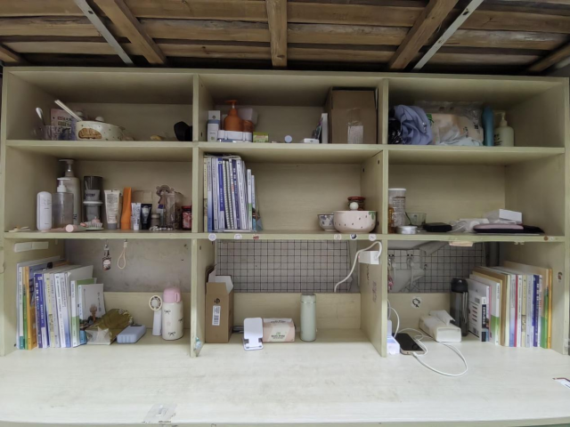 书桌之上,书籍与生活用品分层归类、整齐摆放。既有知识的气息,也有生活的温度,一方小小的角落,成为涵养心灵、规划生活的实用天地。
