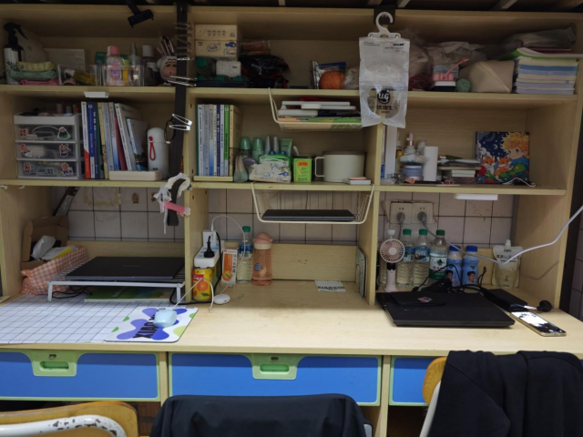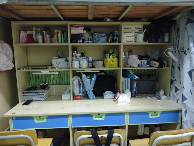 书桌粉蓝为主的色调柔和悦目,每件物品都被妥帖安放:书籍与护肤品并列,文具在篮中乖巧收好。