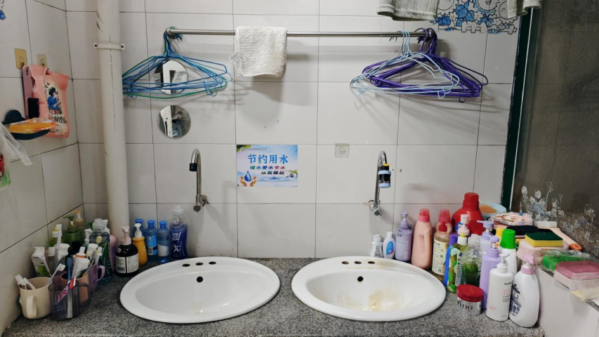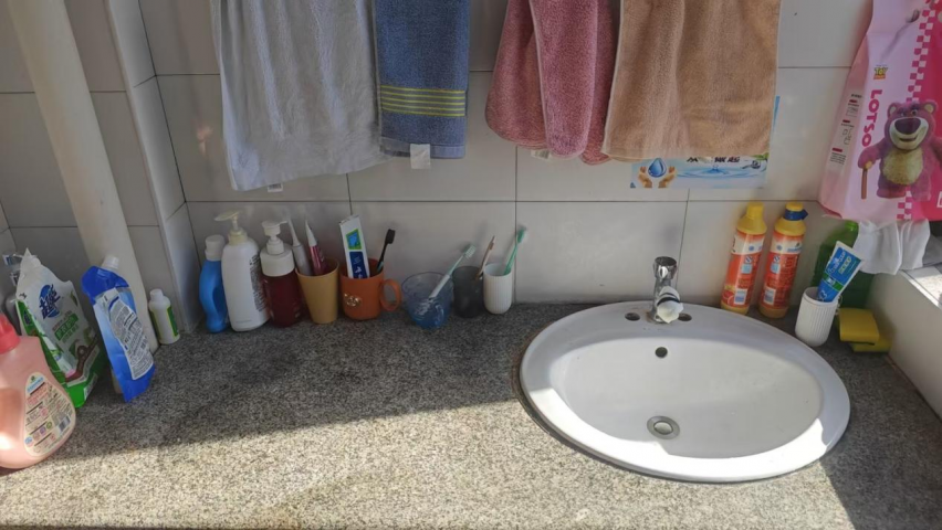 毛巾按颜色挂成一排,洗漱用品在台面上列队站好,阳光从窗户洒进来,照亮这个简单而温暖的小天地。