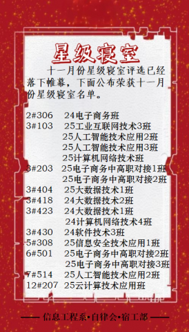 为持续深化学院“安全卫生整治·共创宜居环境”专项行动,信息工程系结合劳动教育理念,依托月度星级寝室评比,推动宿舍文明建设。在十一月的自律会·宿工部常规检查中,涌现出多间标杆寝室,它们严格遵循《信息工程系劳动教育之星级寝室评比办法》,以地面无尘、物品整齐、阳台洁净等细节赢得认可,荣膺“星级寝室”称号。现在,让我们一起走进这些充满劳动智慧的温馨空间,汲取榜样力量吧!