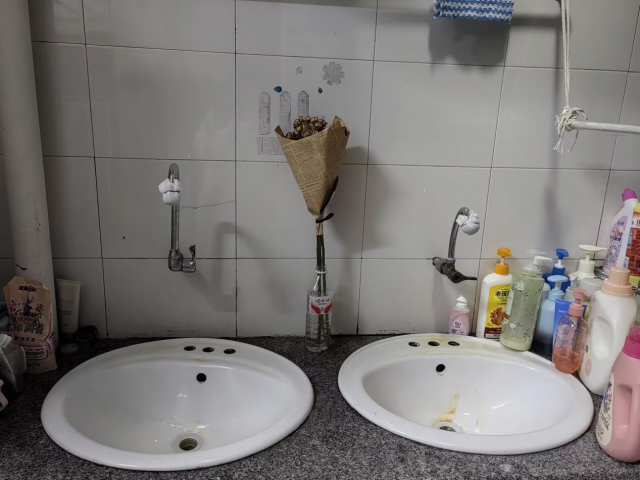 座椅摆放整齐,床铺干净利落,彩色的洗护用品排布得错落有致,洗手盆的陈旧痕迹都显得真实而温暖。