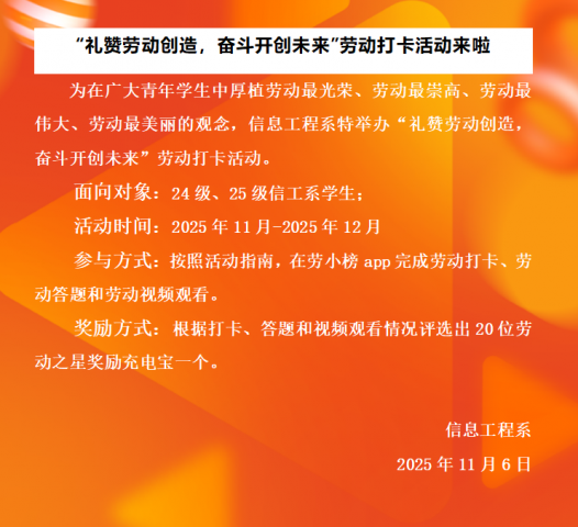 为大力弘扬劳动精神,引导青年学子树立“劳动最光荣、劳动最崇高、劳动最伟大、劳动最美丽”的价值观念,信息工程系于2025年11月6日正式启动了“礼赞劳动创造,奋斗开创未来”主题劳动打卡活动。